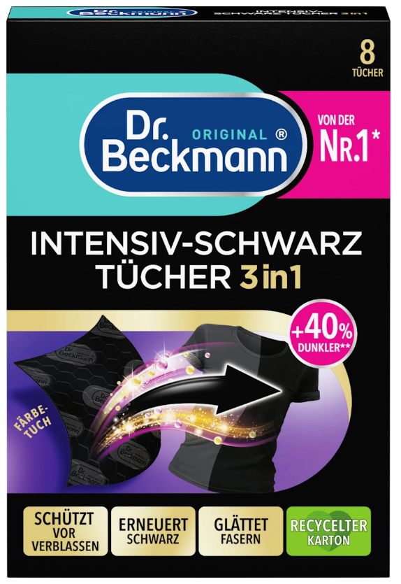 Dr. Beckmann Intensywne Chusteczki Black 3‑in‑1 przeznaczone są do pielęgnacji tkanin czarnych i ciemnych. Jednolity arkusz chusteczki zawiera aktywne barwniki, innowacyjną formułę wygładzającą włókna oraz składniki chroniące kolory, dzięki czemu ciemne ubrania pozostają intensywne, gładkie i wyglądają jak nowe – nawet po wielu praniach.