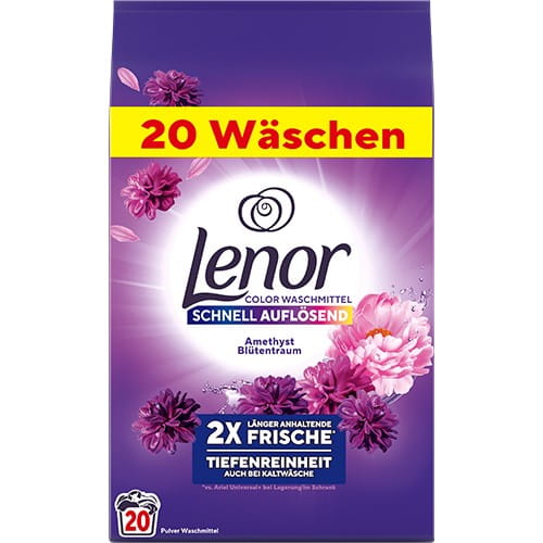 Lenor 2X Color Amethyst to skoncentrowany proszek do prania tkanin kolorowych, zaprojektowany, by zachować intensywność barw i długotrwałą świeżość. Jego formuła oferuje dwa razy większą siłę efektu pielęgnacyjnego — to wyjątkowa troska o kolory w jednym produkcie.