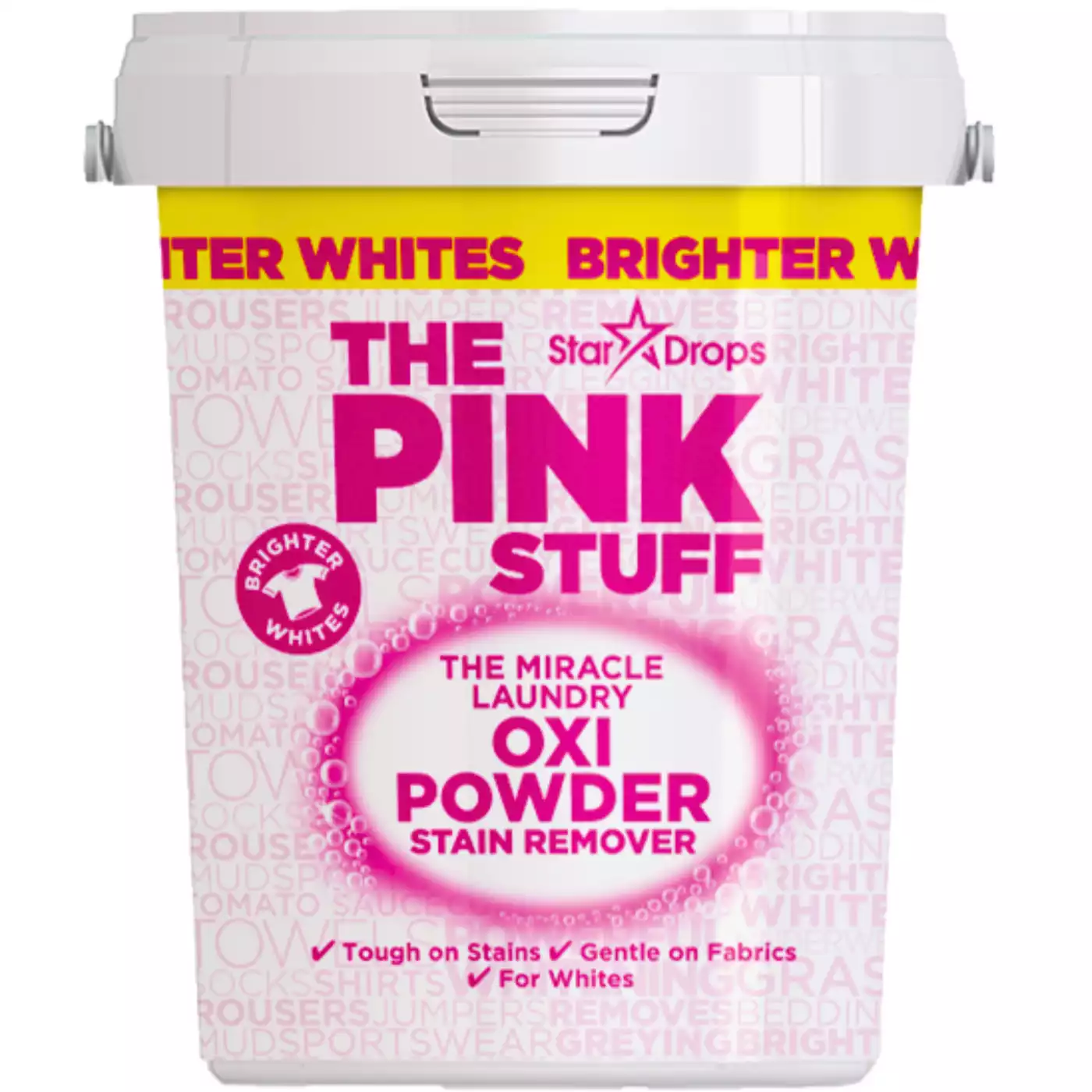 Specjalna wersja proszku tlenowego uzupełniająca linię Pink Stuff – przeznaczona do białych tkanin. Formuła oparta na aktywnym tlenie usuwa trudne zabrudzenia (wino, herbata, pot, trawa), przywracając białym tkaninom blask. Pozostawia świeży charakterystyczny zapach Pink Stuff. Produkt jest skuteczny zarówno jako środek do prania, jak i do wstępnego namaczania.